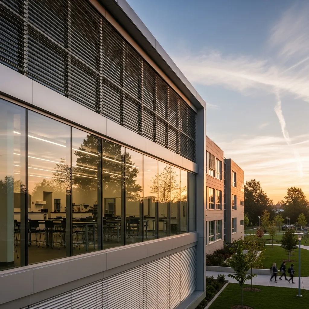 Universities, schools, and training facilities requiring glare control and AV compatibility. Motorized classroom shades with preset positions, light-filtering fabrics maintaining visibility while reducing screen glare, and durable components for high-traffic environments.